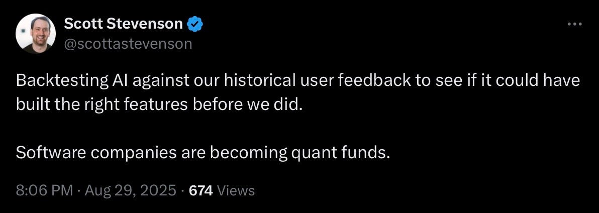 But elements of SaaS companies are backtest-able. For instance, we ran a backtest recently to see if an AI PM could have come up with the right feature ideas before our own team did, by feeding in customer feedback. In a couple cases, it did beat us.
