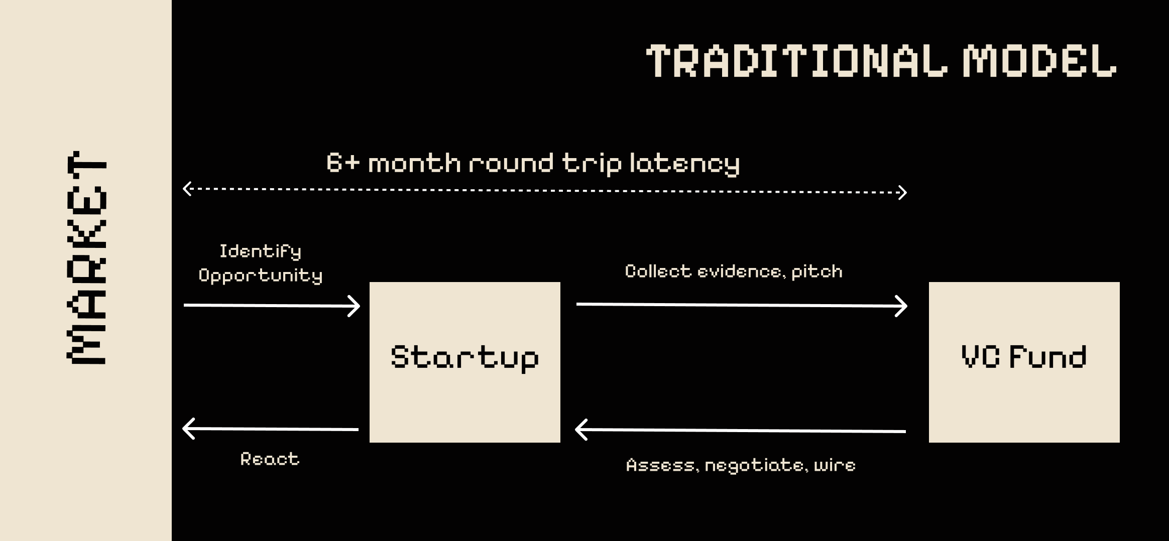 The existing VC model will be at a significant latency disadvantage after 10x acceleration in software. Today, when an opportunity arises in the market, a founder must identify it, collect evidence on it, pitch it, get a term sheet, go through legals, wait for a wire to arrive, hire a team, and execute against it. This takes months.